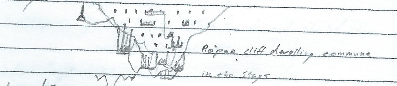 And speaking of the Ro’pan, I also have a doodle of a Shard Field waystation. A stopping point, to rest, relax, and share a story for Ro’pan traveling the Field and the rope-ways.